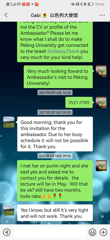 תמונה 2: שיחת WeChat שמראה כיצד דחתה השגרירות הישראלית הזמנה לביקור באוניברסיטת פקין – הבמה האקדמית המשפיעה ביותר בסין; זוהי המחשה חיה של פספוס הזדמנות משמעותית לדיפלומטיה ציבורית עבור ישראל.