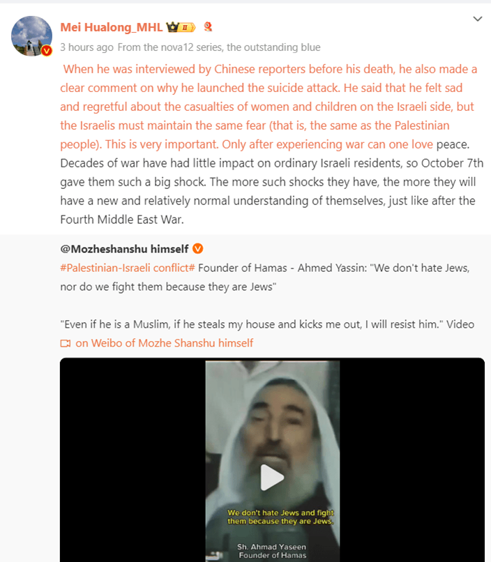 תמונה 5: מיי הואלונג – בוגר הרווארד שמשמש מרצה בכיר במחלקה העברית בבית־הספר לשפות זרות שבאוניברסיטת פקין ועמית־מחקר במכון ללימודי ישראל ויהדות – מבלה ככל הנראה כמה שעות ביום בהפצת תוכן אנטי־ישראלי ואנטישמי בוטה (תחת האצטלה של אנטי־ציונות) ל־1.12 מיליון עוקביו, תוך כדי זרם מתמיד של אפולוגטיקה עבור מחבלי חמאס ("ההתנגדות היא הדרך היחידה לשלום") ותקיפת כל גורם סיני שתומך בישראל.[2]