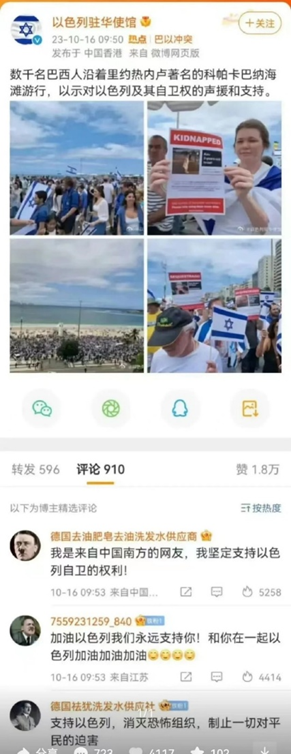 תמונה 6: בחשבון הרשמי של השגרירות ב־WeChat, תגובות עם תמונת פרופיל של היטלר לא רק נותרו גלויות, אלא אף הודגשו כ"תגובות נבחרות" – סימן לכשל חמור בביקורת התוכן.