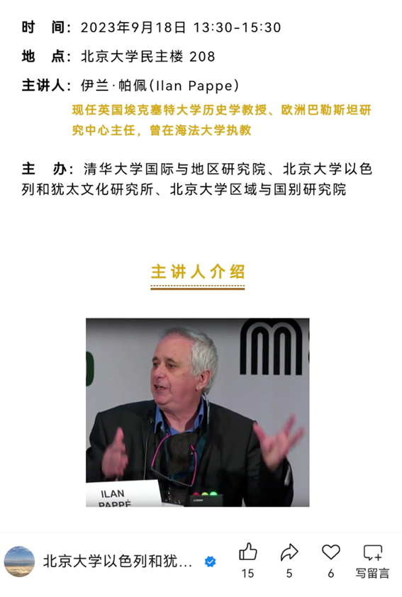 תמונה 1: ב־18.9.2023 הוזמן אילן פפה לדבר באוניברסיטת פקין על־ידי המחלקה העברית באוניברסיטה.