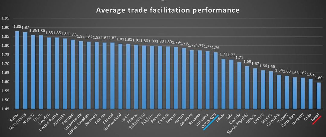 Therefore, aside from the steps Israel should take at the diplomatic level, this is another opportunity to understand the importance of working towards easing the regulatory burden on importation and making it more accessible andtransparent. According to research by the UN Trade and Development Conference, non-tariff trade barriers contribute more than twice to blocking the entry to market than tariff measures. Israel today is rated last among all OECD countries on a measure of ease of trade (measured by Trade Facilitation Indicators or TFIs), even lower than the only member states defined by the World Bank as middle-income – Costa Rica, Colombia, and Mexico. TFIs cover the entire spectrum of trade border procedures such as preliminary requirements, fees, cooperation between different agencies, and more. Another interesting fact to note is that Israel also scores lowest on the good governance and impartiality indicator, a measure that examines transparency, public accessibility, and the impartiality of the agencies involved in importation.